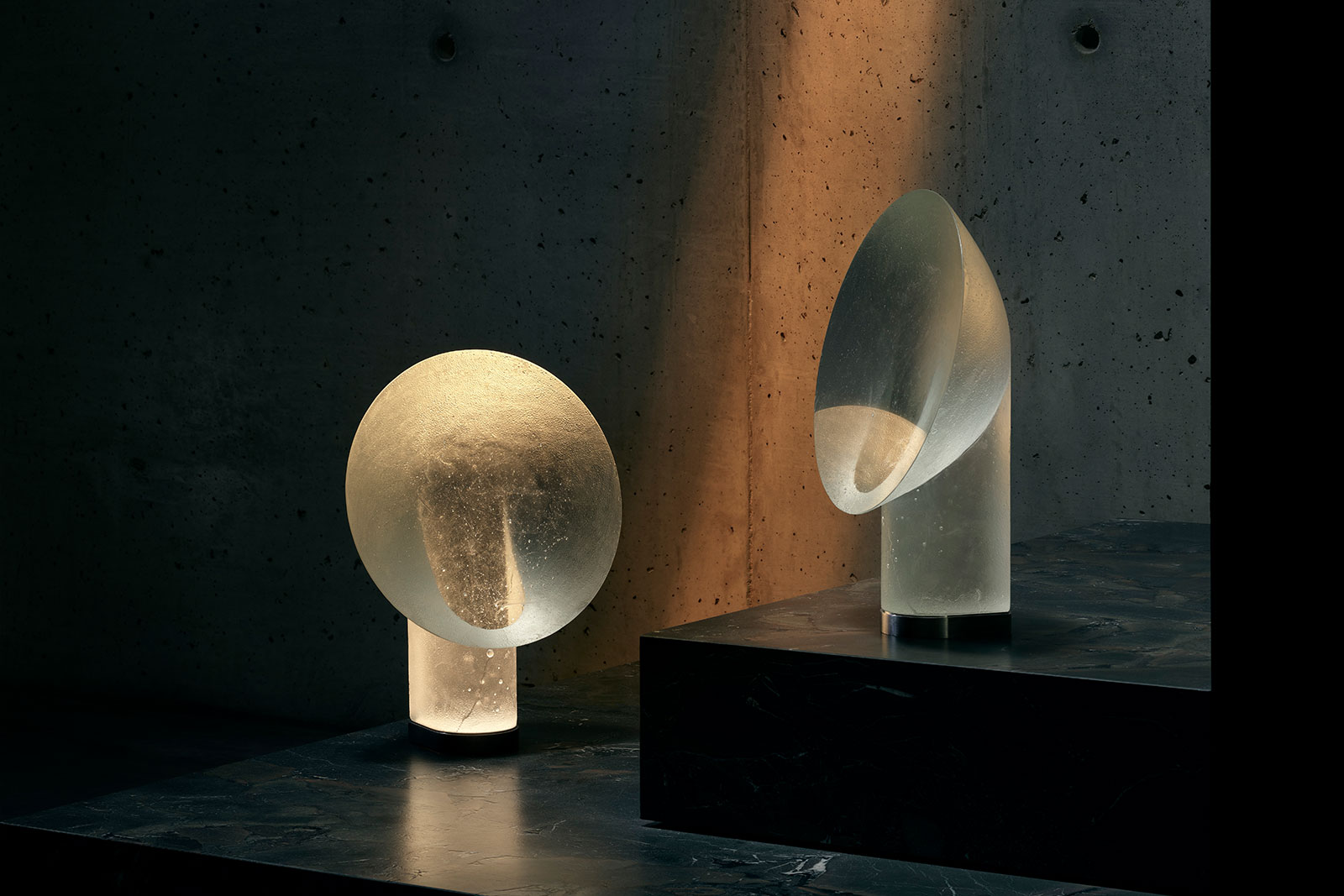 Solace is a luminous glass tear that transforms with movement, revealing two distinct identities in light and from. Available as a pendant and table lamp.