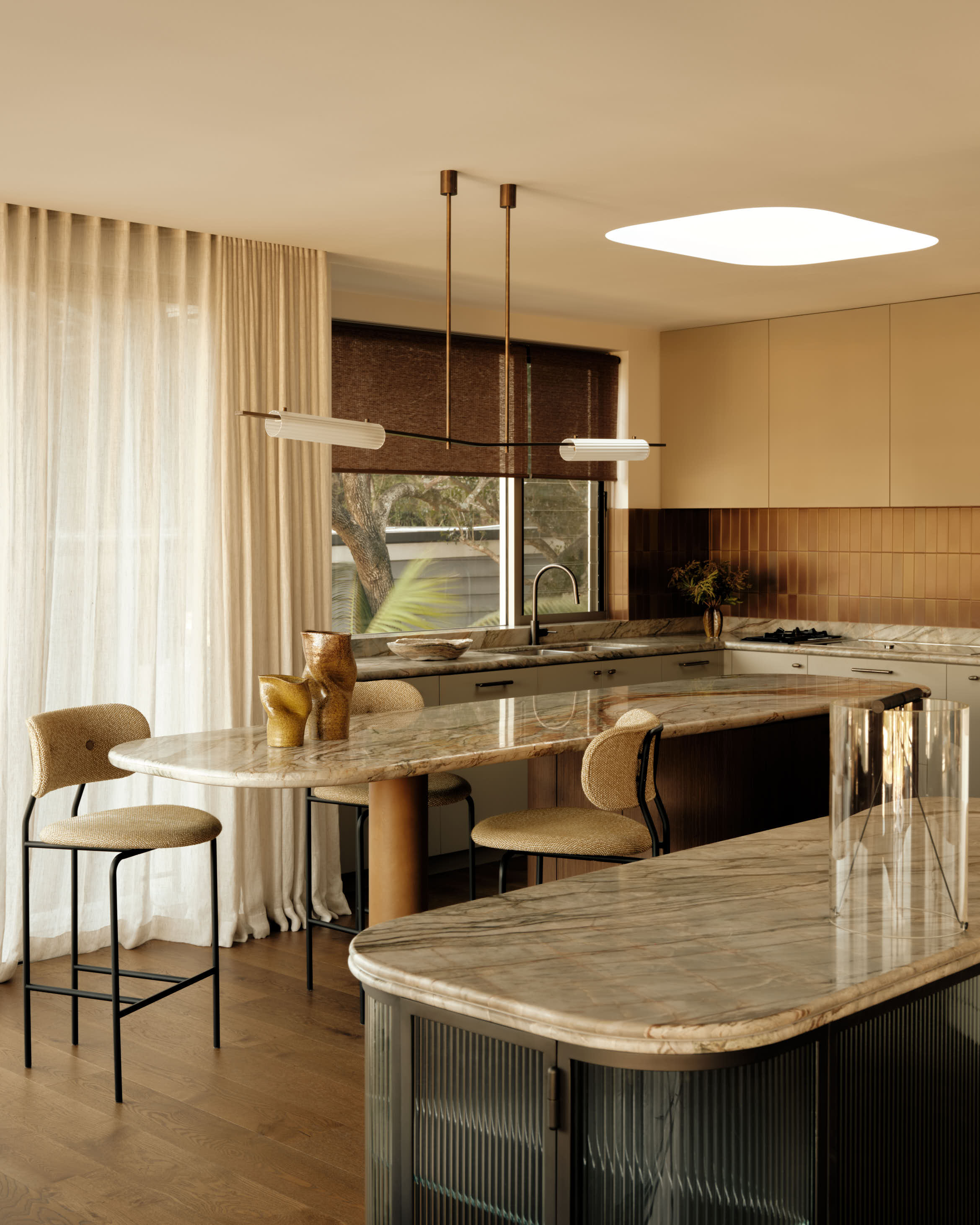 Originally a 1960s apartment block, the house has been reimagined with sculpted voids, re-planned rooms, and a palette inspired by sandstone, eucalyptus, and coastal dusk.