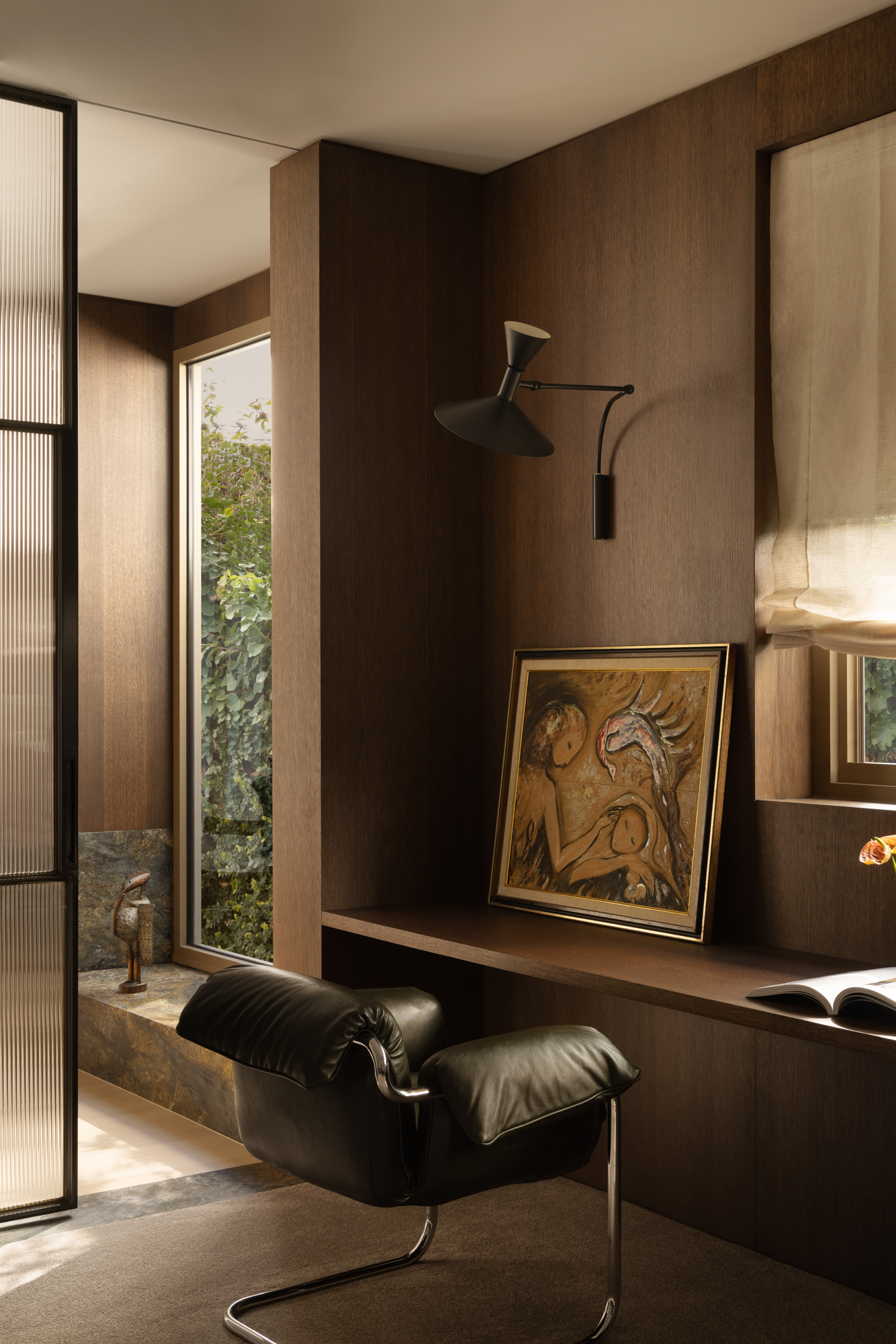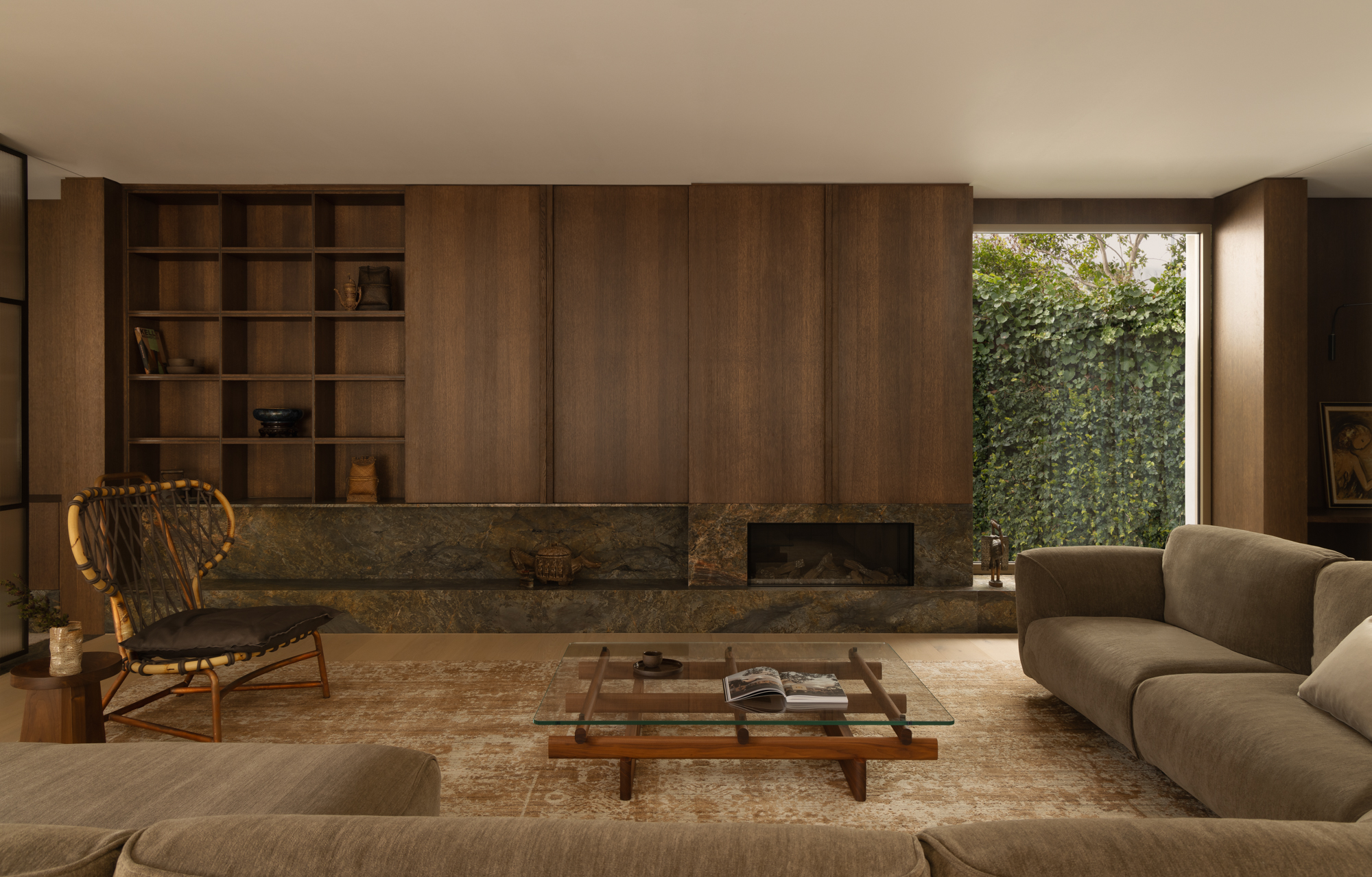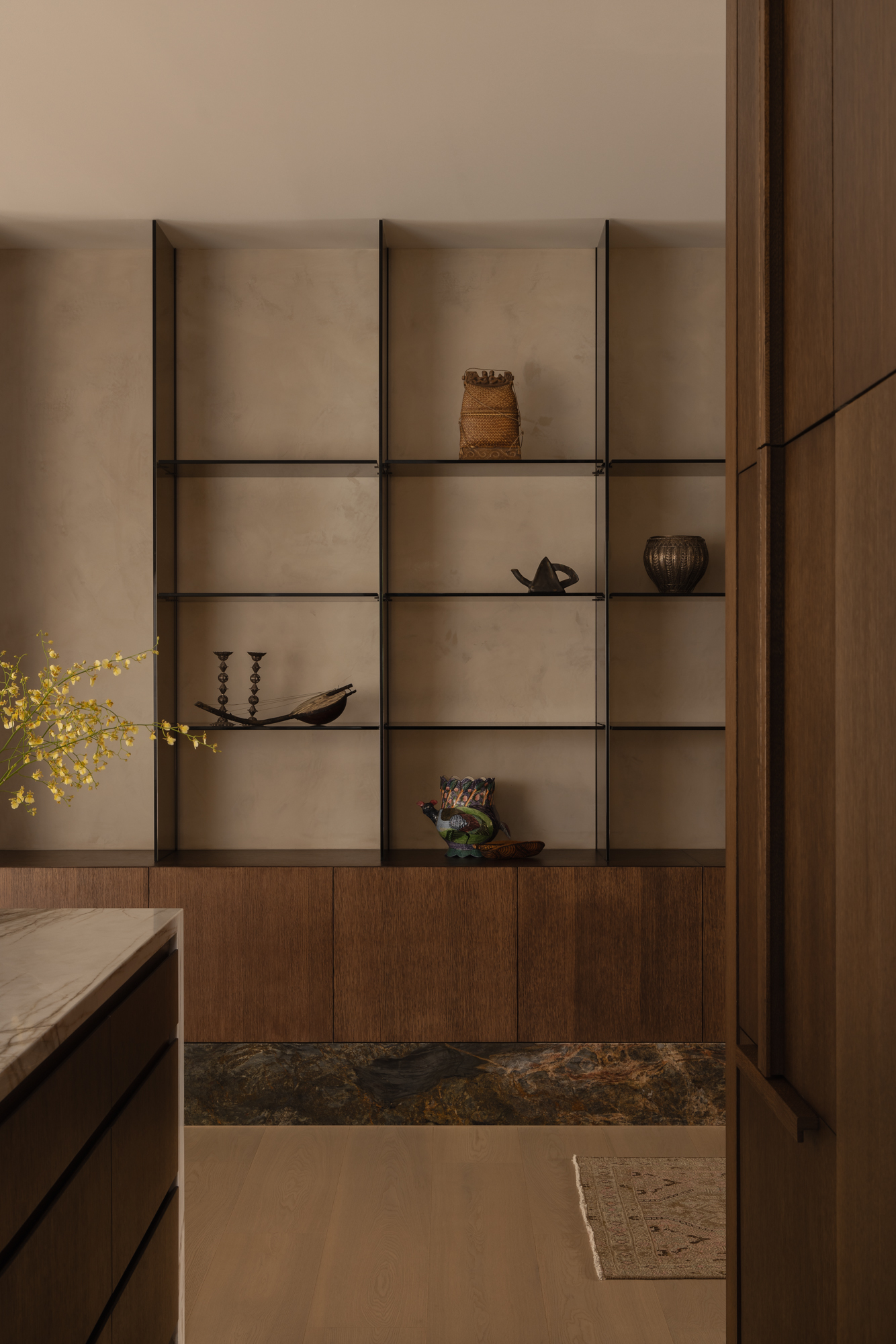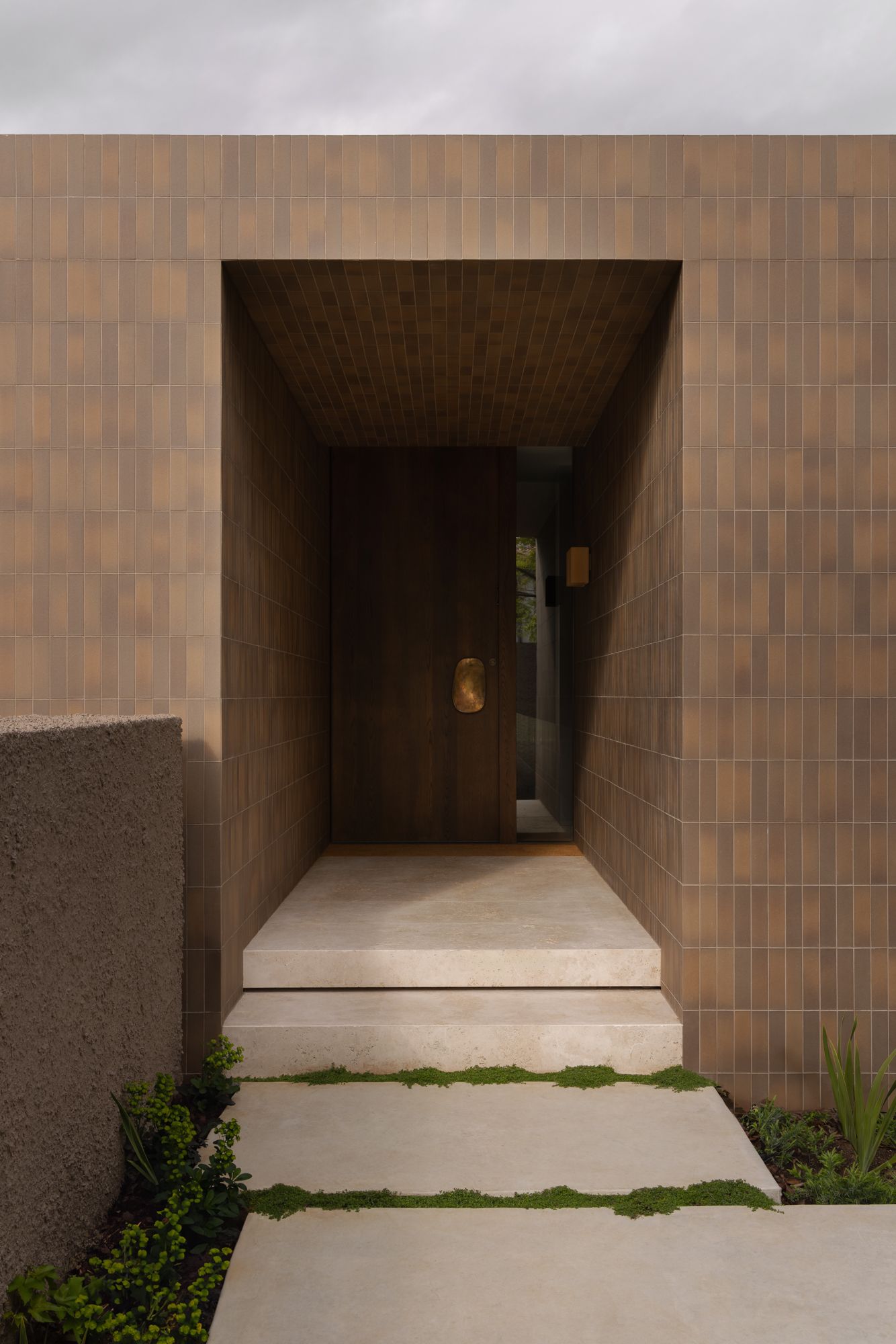 Concealed behind a façade of intricately crafted tiles, a natural warmth tints the interior of Montana Jewel as the light filters through bronzed framed windows and honey toned sheer curtains. A grand timber pivot door with a dark, rich grain and a handcrafted bronze handle, serves as an impressive entry to the home – a stunning design collaboration between Homeroom Studio and ADDARC.