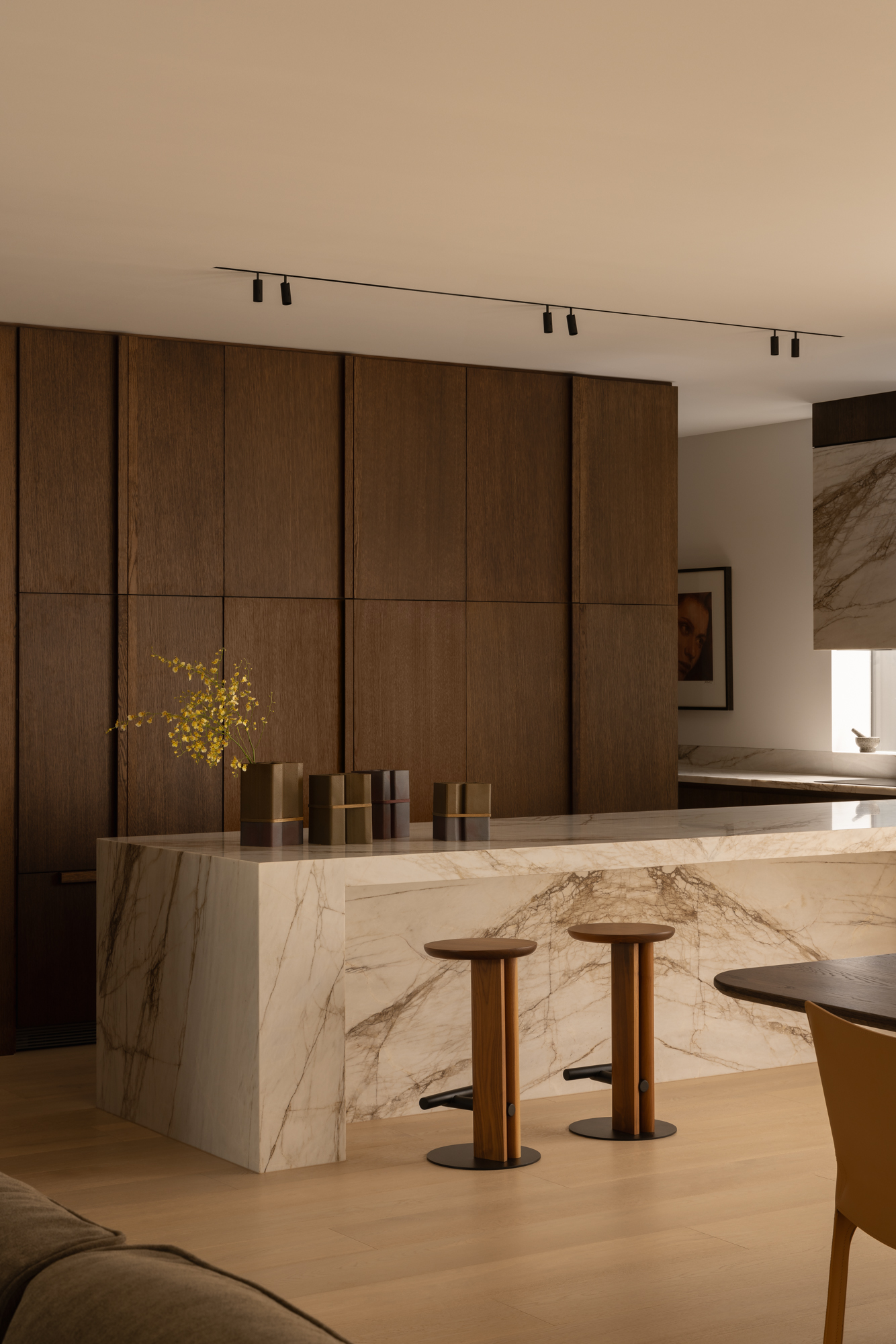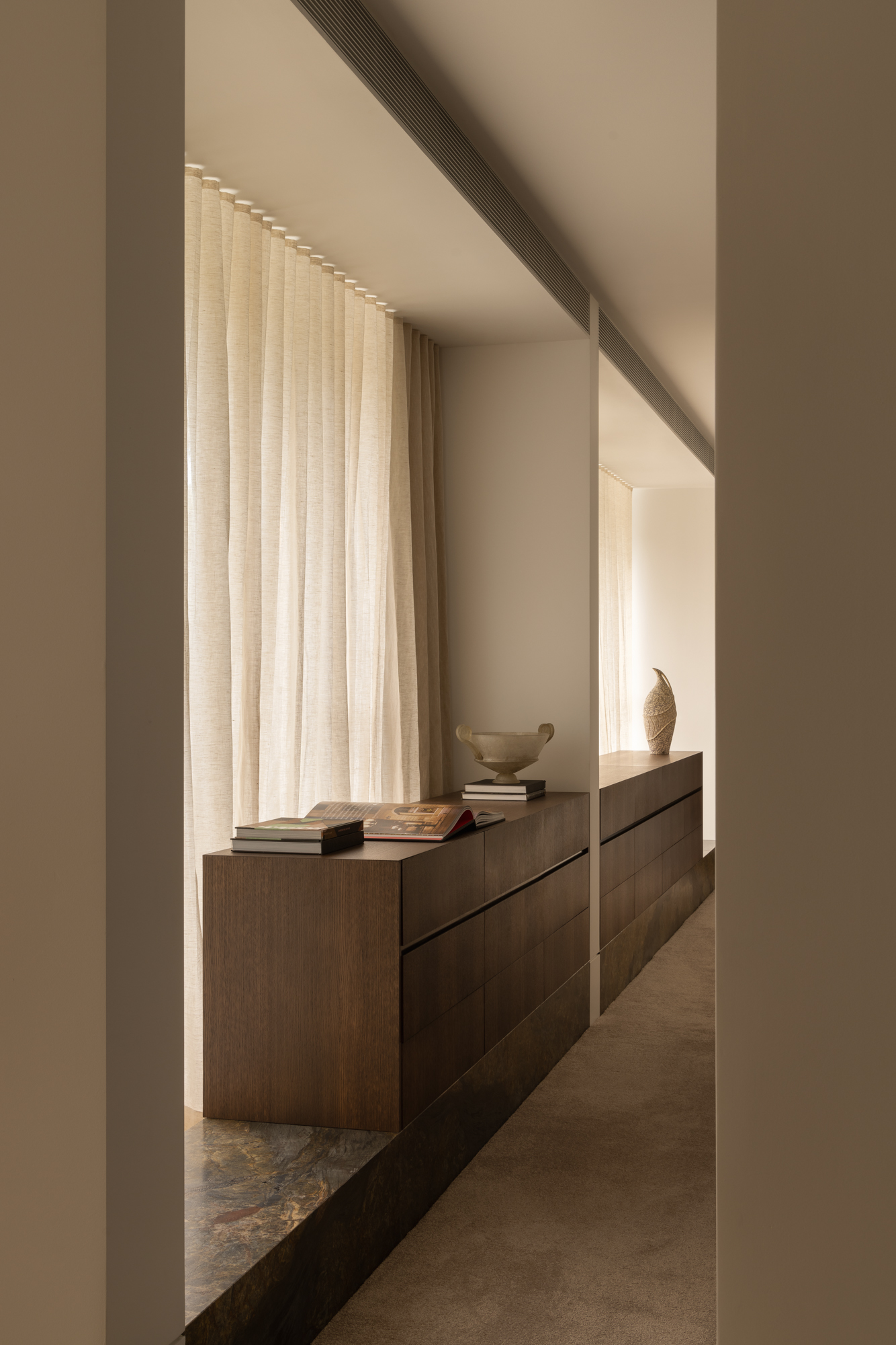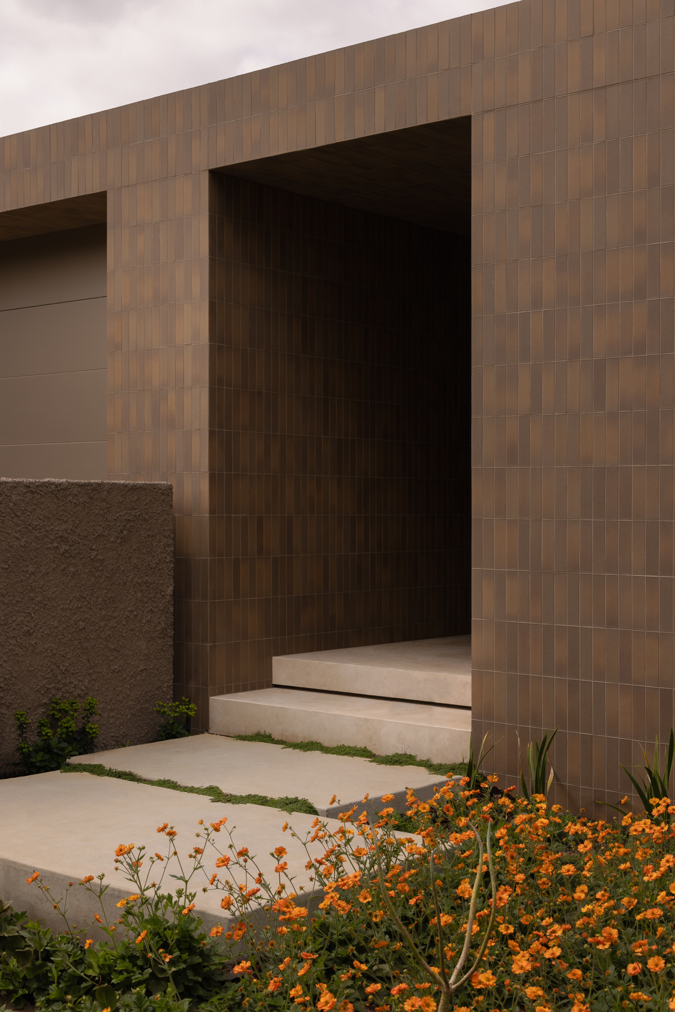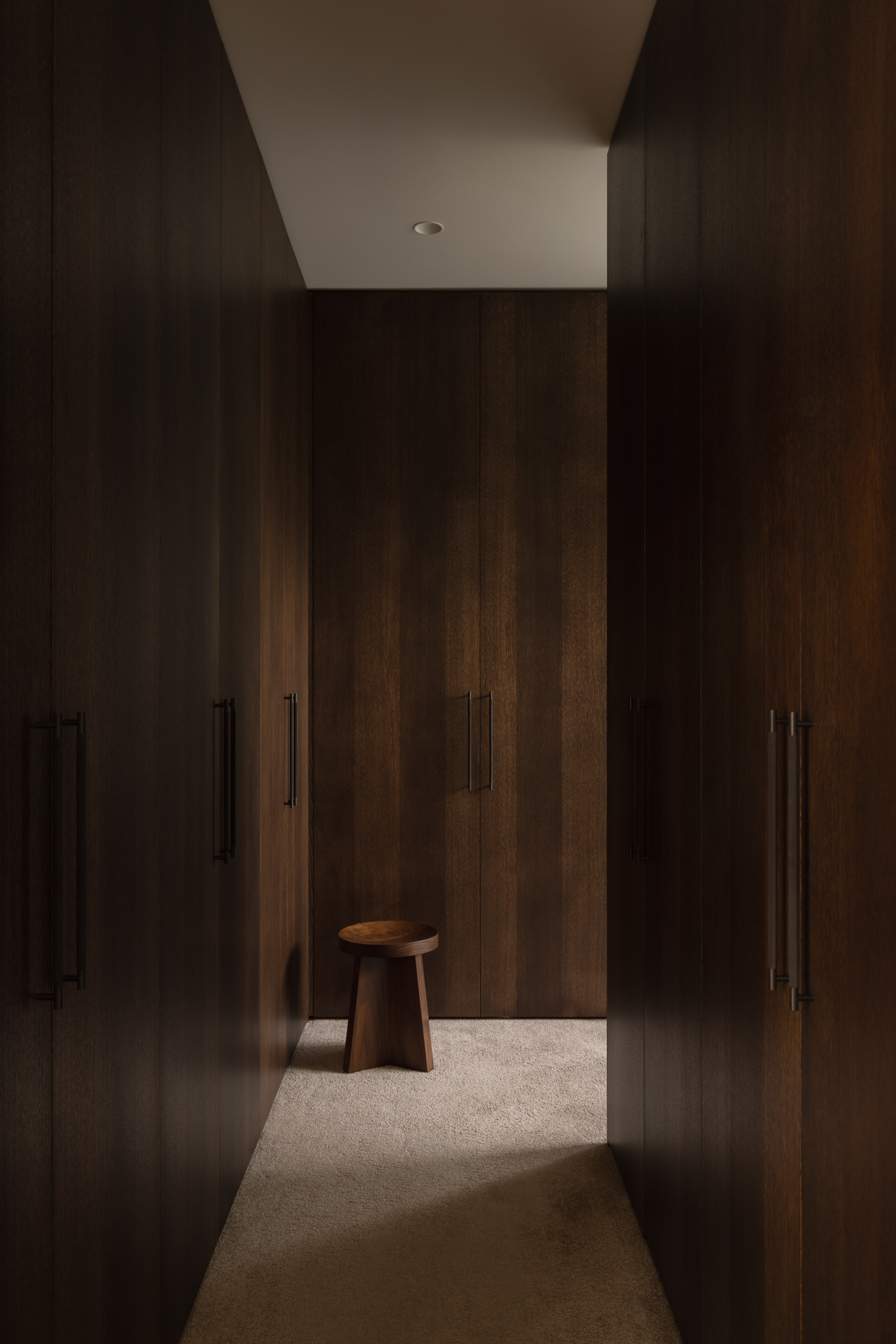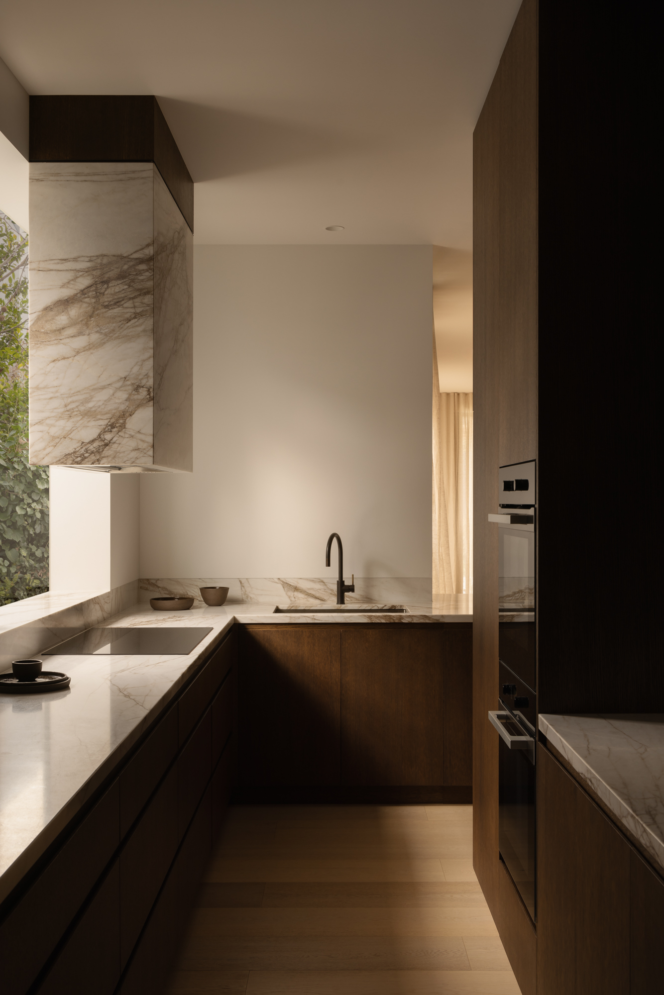 Concealed behind a façade of intricately crafted tiles, a natural warmth tints the interior of Montana Jewel as the light filters through bronzed framed windows and honey toned sheer curtains. A grand timber pivot door with a dark, rich grain and a handcrafted bronze handle, serves as an impressive entry to the home – a stunning design collaboration between Homeroom Studio and ADDARC.