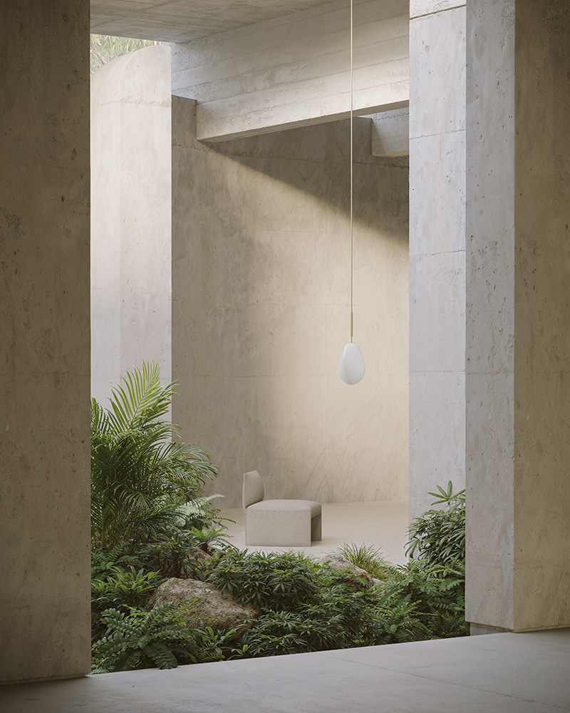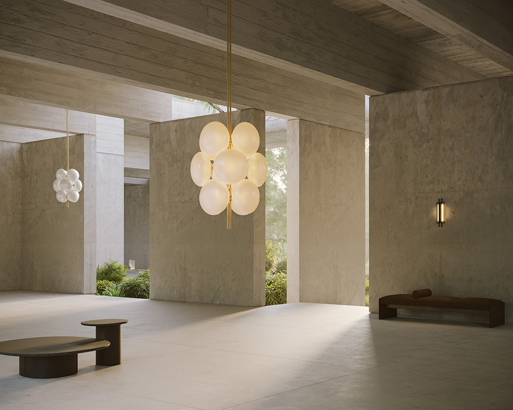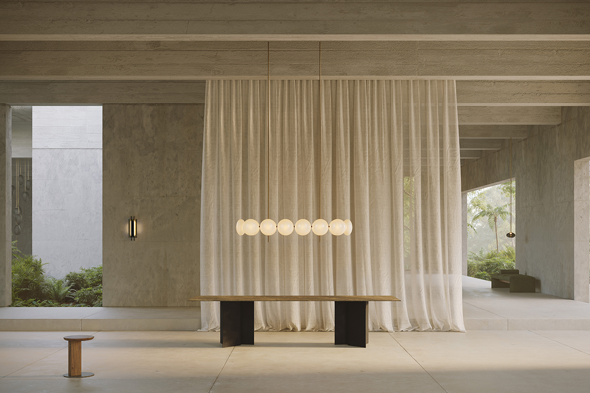 The inspiration behind Pavilion stems from Gardam’s long-standing fascination with Brutalist architecture. In particular, the honesty and monolithic sense of grandeur. The façade is open, expansive and inviting, drawing focus first to the curved entry, revealing the Aeris Chandelier and Solace Table Lamp, with beams which compel people to continue through the interior until arriving at the internal courtyard of the atrium. The atrium, in turn, transitions to the Australian bushland outside.