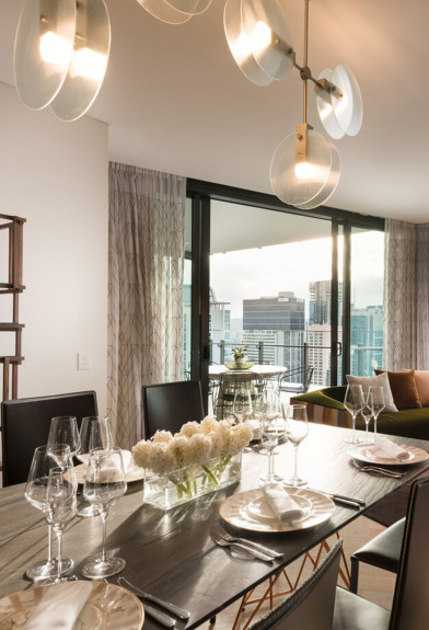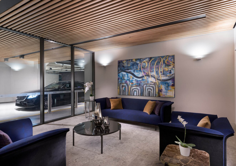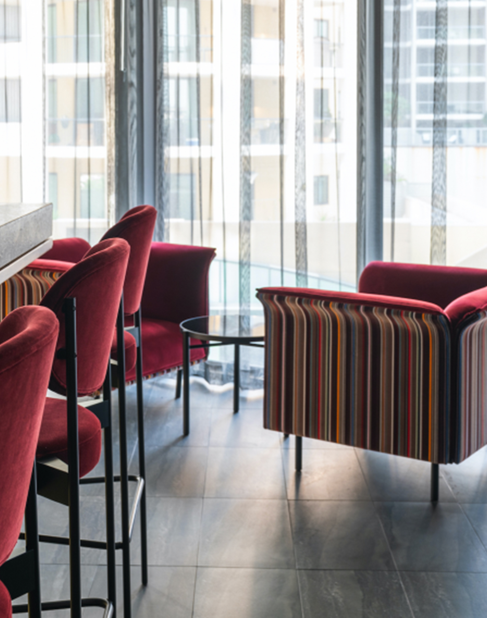 The private bar has a beautiful and rich red palette, teaming Harald by Raf Simons with Velvet Stripe by Paul Smith. Harald, originally designed by Fanny Aronsen, and with more recent palettes conceived by Raf Simons, is a closely woven, very-short-pile velour with a directionless velvety texture. The intense ruby-red colour emphasises the shape and contours of the objects it upholsters – bar stools from Space and the interior of Ross Gardam’s Noon Armchairs sourced from Stylecraft. Velvet Stripe by Paul Smith is on the exterior of the armchairs, and injects shots of orange, pink, blue and green into the palette by way of the English fashion designer’s tailored yet eccentric, playful style.