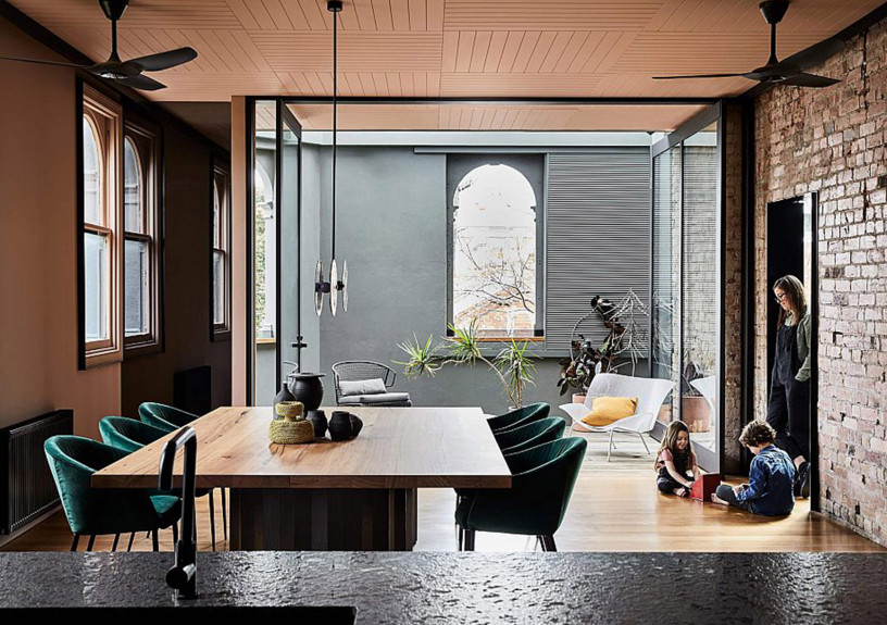 The design is first and foremost a process of reduction to allow the character of the original building to be the primary feature. A key component of this is to retain and reveal the masonry construction giving the home an undeniable warehouse feel. Many original details such as arched doors and fireplaces are maintained in working order. Where possible the imperfection of the brick walls are celebrated as an indication of their history. At a few points glazing is used to fill gaps in the masonry to clearly delineate what is original and what is new. At the ground level, the original timber ceilings are also exposed.