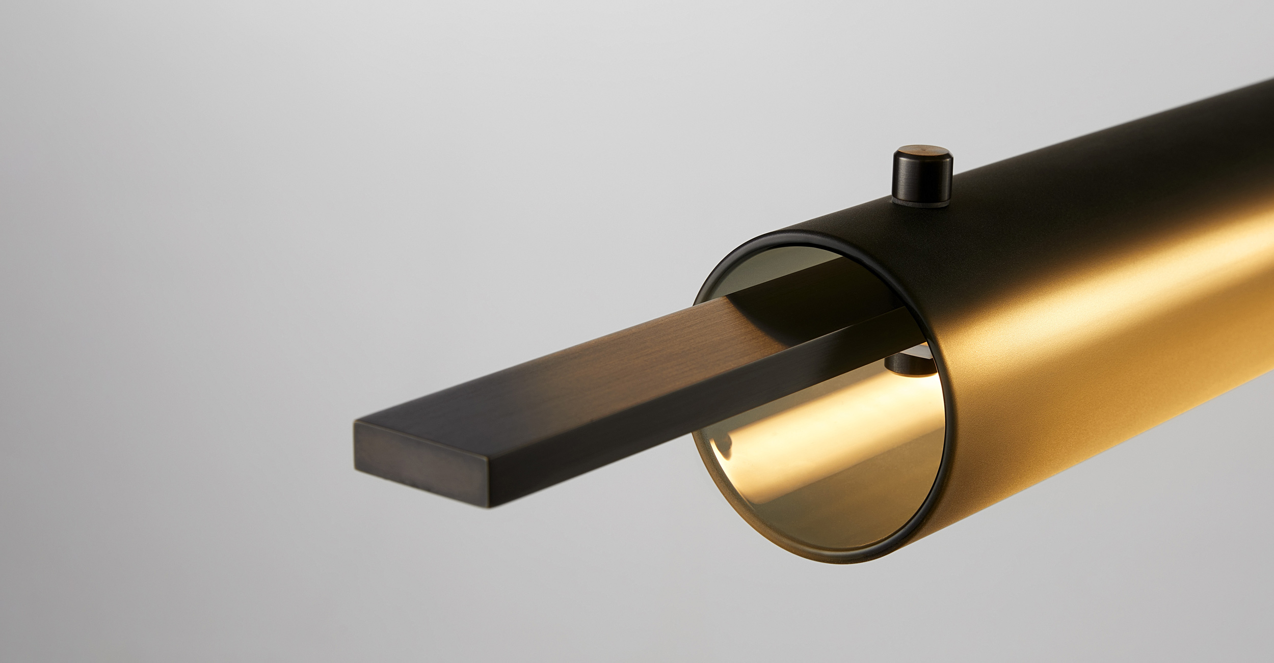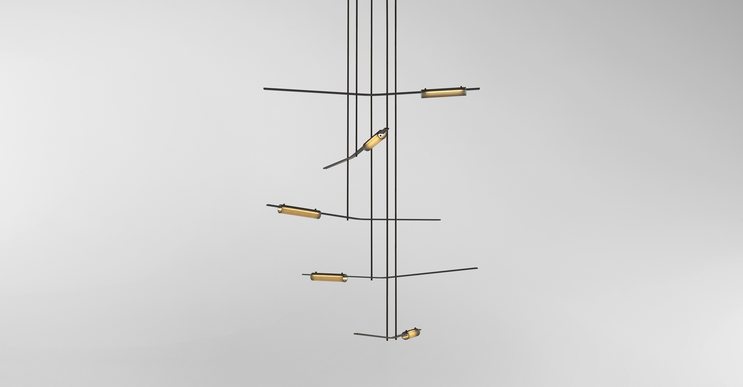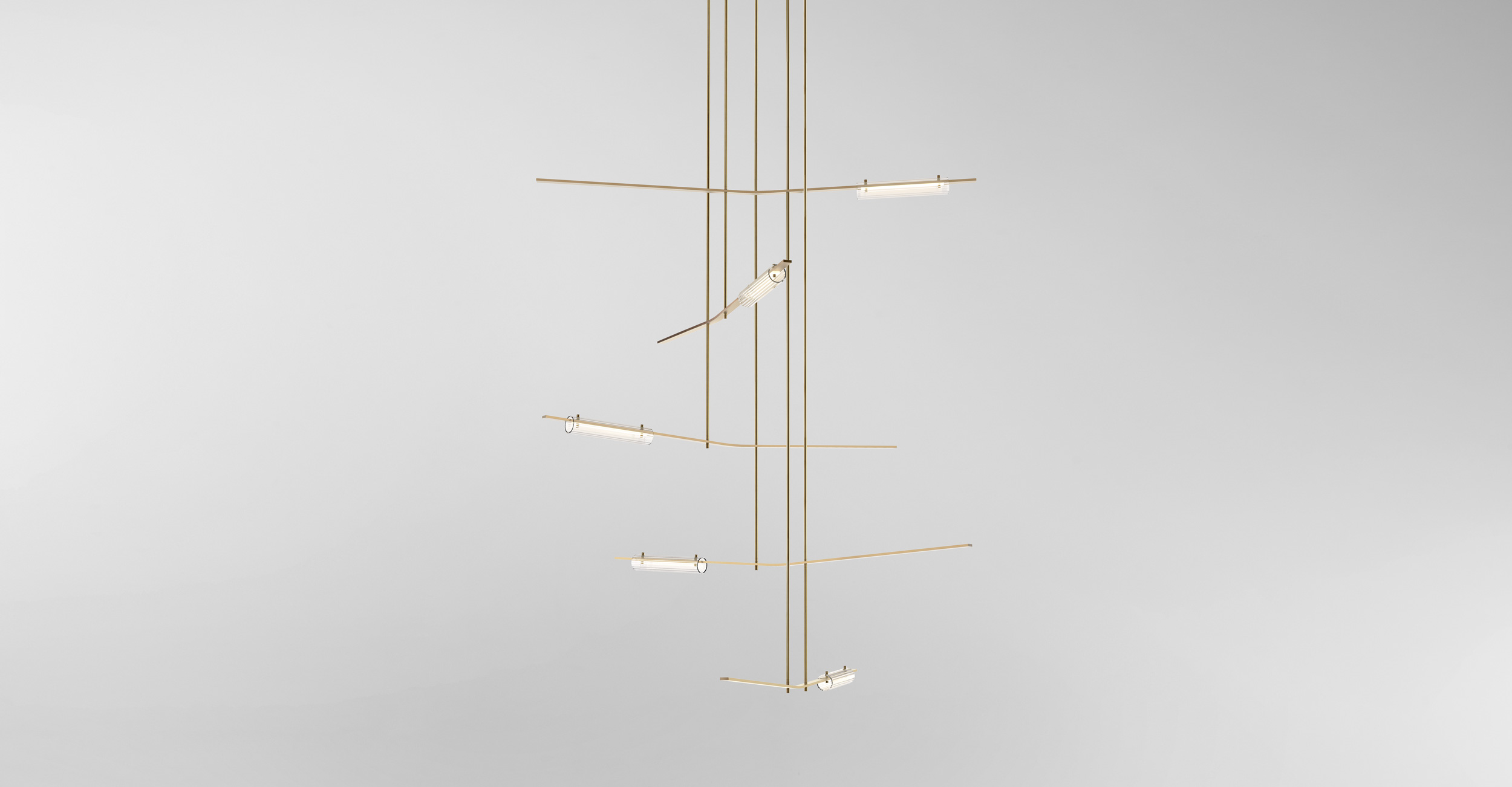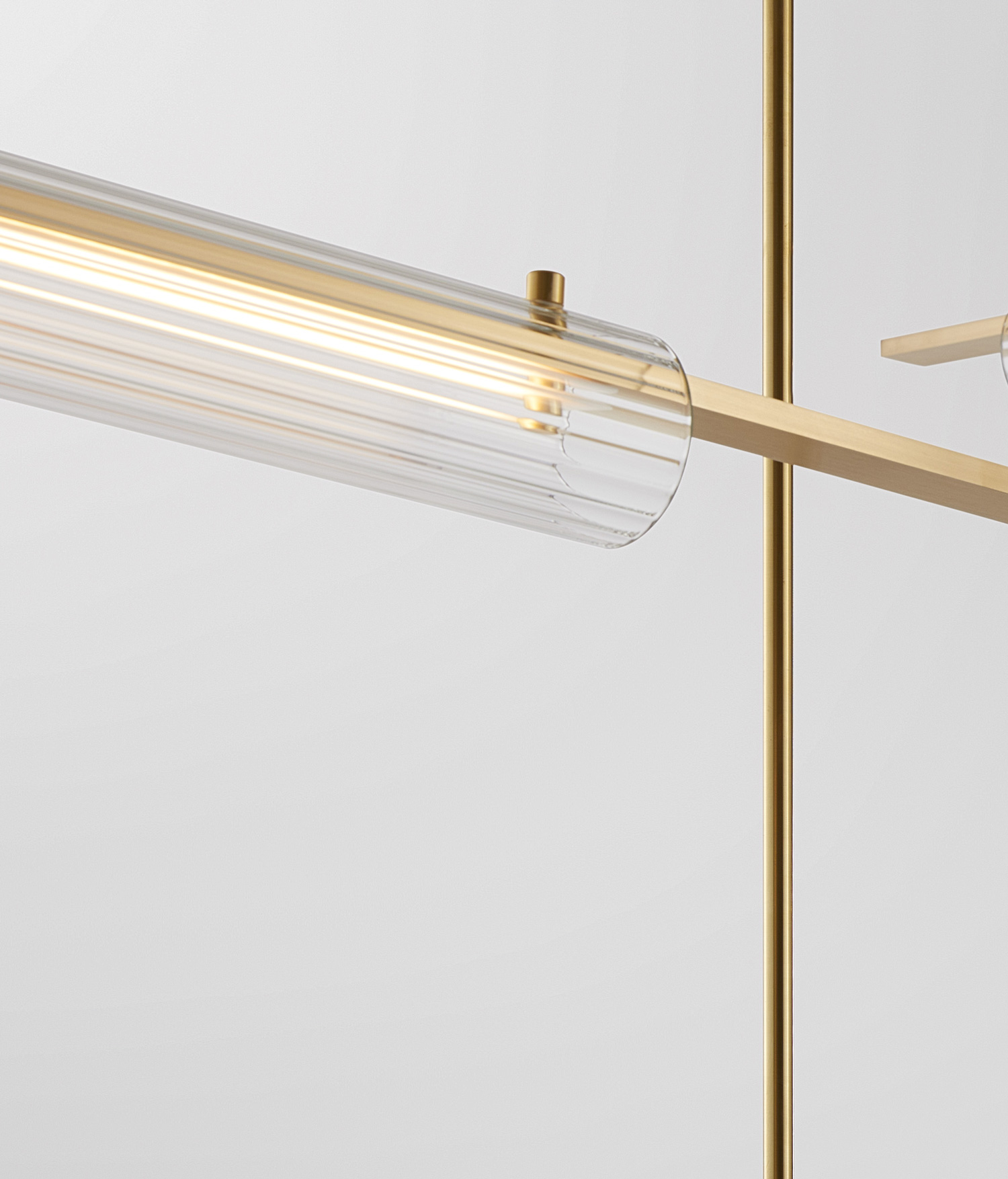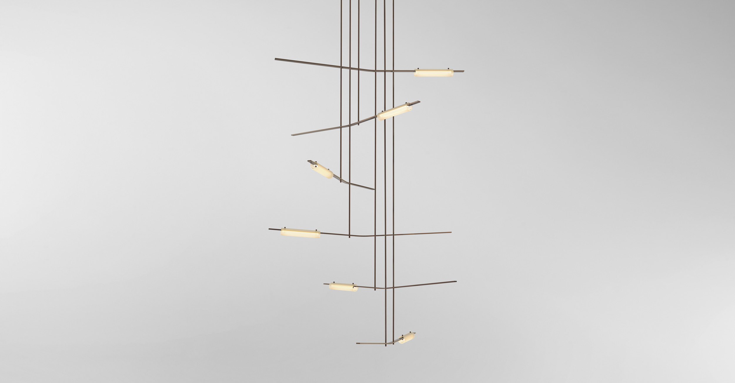 Volant’s modular and architectural nature allow the fixture to span across a plethora of interior spaces. The solid brass bars are individually machined with the luminaire defined by a white glass diffuser which is pinned in-place to the solid brass bar. Textured tubular glass elements are balanced on the same pins creating a uniquely formed illumination.